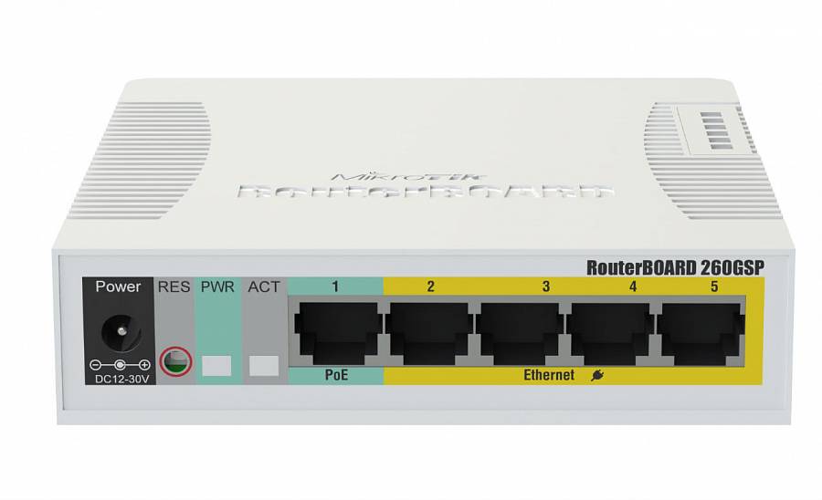 Модель RB260GSP оснащена мощным процессором Taifatech TF470, использует ОС SwOS, функционирует в бесшумном режиме. Управление устройством осуществляется при помощи удобного веб-интерфейса.