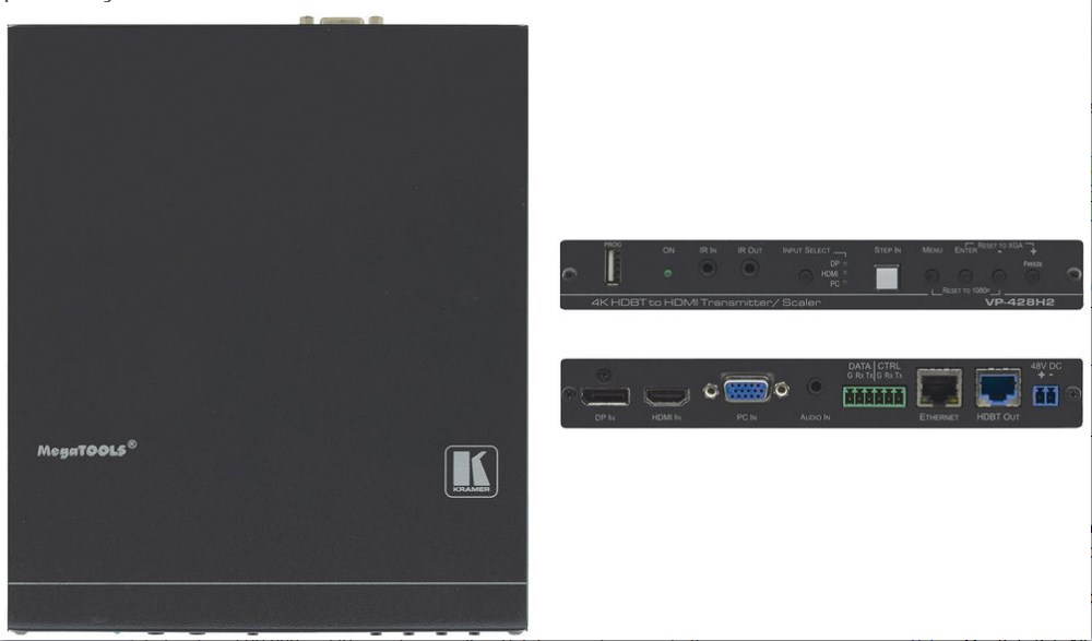 VP-428H2 - это превосходное и высокотехнологичное устройство, представляющее из себя масштабатор сигналов HDBaseT разрешением 4K с входами HDMI, DP и VGA, который поддерживает HDBaseT-туннелирование Ethernet, двунаправленные сигналы RS-232 и ИК, а также PoE для подачи питания на приемник HDBaseT. Он принимает выбранный AV-сигнал, увеличивает, уменьшает масштаб или обходит видео в соответствии с настройками, выбранными пользователем, и преобразует его для отправки через HDBaseT вместе с туннелированными данными и PoE