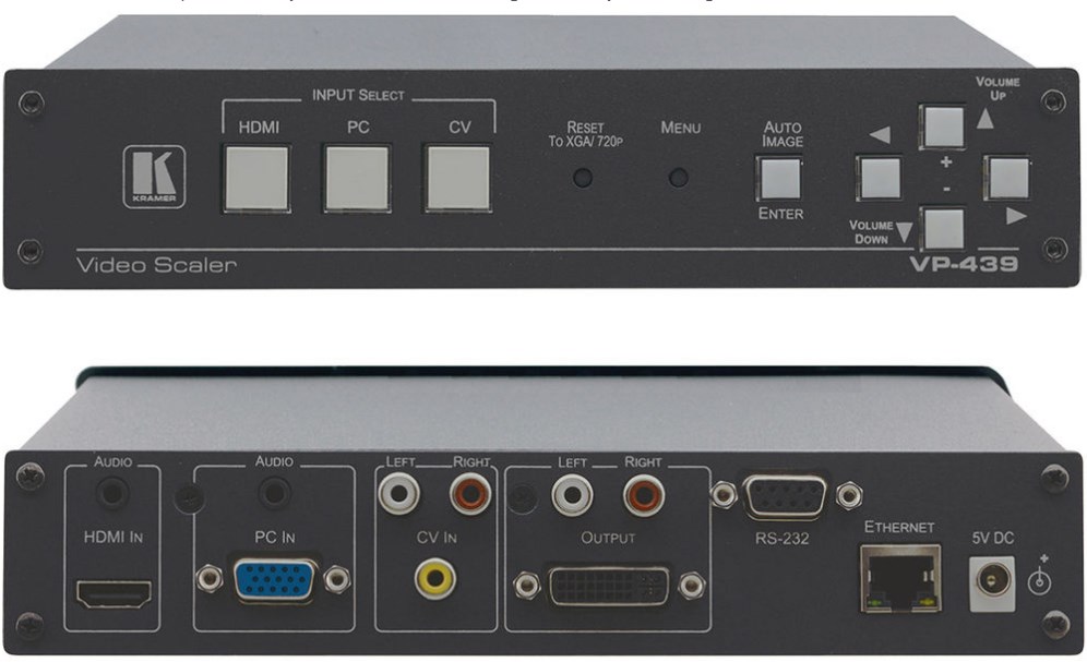 VP-439 - это превосходное и высокотехнологичное устройство, представляющее из себя масштабатор для компьютерной графики, видео, композитных сигналов и сигналов HDMI, включая аудио. Он увеличивает/уменьшает выбранный вход HDMI, CV или компьютерной графики видео/YPbPr и выводит его на HDMI через разъем DVI-I