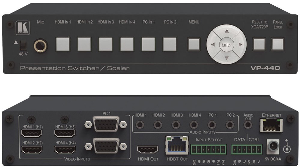 VP-440 - это превосходное и высокотехнологичное устройство, представляющее из себя масштабатор для презентаций с четырьмя входами HDMI и двумя входами для компьютерной графики (VGA). Устройство масштабирует видео, встраивает звук и выводит сигнал на выход HDMI и выход HDBaseT одновременно. Устройство включает аналоговые и встроенные аудиовходы и выходы