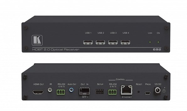 Kramer 692 - это превосходный и высокопроизводительный оптоволоконный приемник HDBaseT 2.0 для расширения до 4K при частоте 60 Герц. приемник преобразует оптоволоконный сигнал HDBaseT 2.0, полученный от передатчика расширенной линии, такого как Kramer 691, обратно в выходные сигналы HDMI, USB 2.0, Ethernet, RS-232, ИК и стереофонический аудиосигнал 4K60 Герц HDMI, USB 2.0, Ethernet, RS-232. Устройство способно принимать видеосигнал на расстояние до 33 км по одномодовому оптоволокну