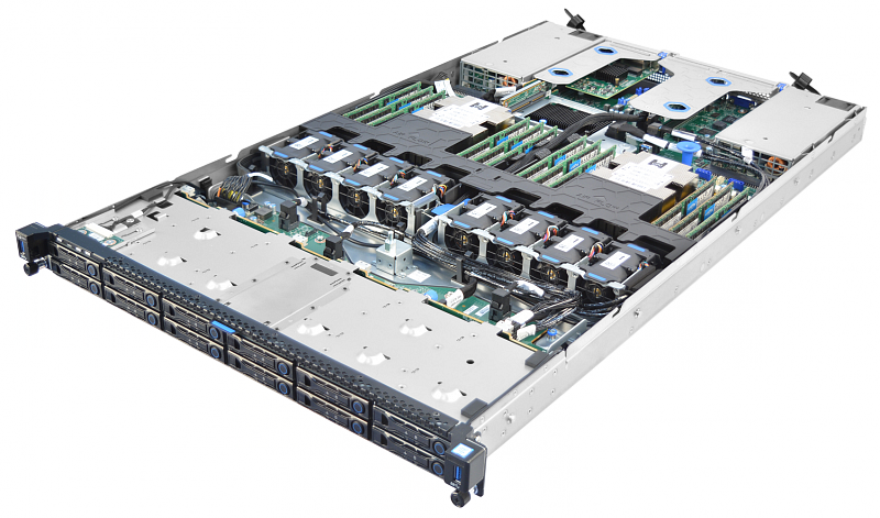 Сервер имеет 1U форм-фактор. Сервер двухпроцессорный . В него устанавливаются процессоры семейства Intel® Xeon® Scalable 1/2 поколений, согласно требованиям по теплоотводу(TDP –Thermal Design Power) не более 165Вт. Сервер имеет 24 слота памяти, и может масштабироваться до 3 Тб ОЗУ. Возможно использование RDIMM/LRDIMM DDR4 до 2666 MT/сек 6 каналов памяти. В сервер возможно установить 12 дисков “горячей” замены”. Поддерживаются диски NVMe(8), SATA и SAS. В сервер могут быть установлены RAID адаптеры. Сервер оборудуется двумя Platinum/Titanium блоками питания. Предлагаются различные по мощности блоки питания.