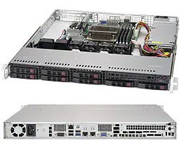 Диски подключаются с помощью 8-портовой гибридной объединительной платы 1U SAS3 12 Гбит/с. Серверный корпус оборудован блоком питания 340W с сертификатом Platinum level. Шасси имеет пространство для одного слота расширения полной высоты и полной длины.