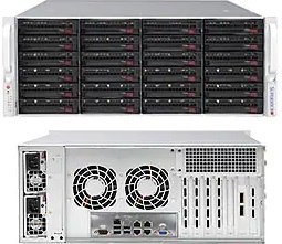 Диски подключаются с помощью 24-портовой объединительной платы расширения 4U SAS3 12 Гбит/с с одним расширителем. Серверный корпус оборудован двумя блоками питания, с резервированием, 1200W, Titanium Level. Шасси имеет пространство для семи слотов расширения полной высоты и полной длины.