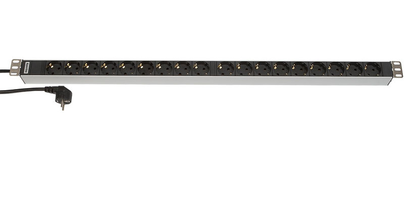 Hyperline SHT-18SH-2.5EU Блок розеток, вертикальный, 18 розеток Schuko, кабель питания 2.5м (3х1.5мм2) с вилкой Schuko 16A, 250В, 945x44.4x44.4мм (ДхШхВ), копрус алюминий