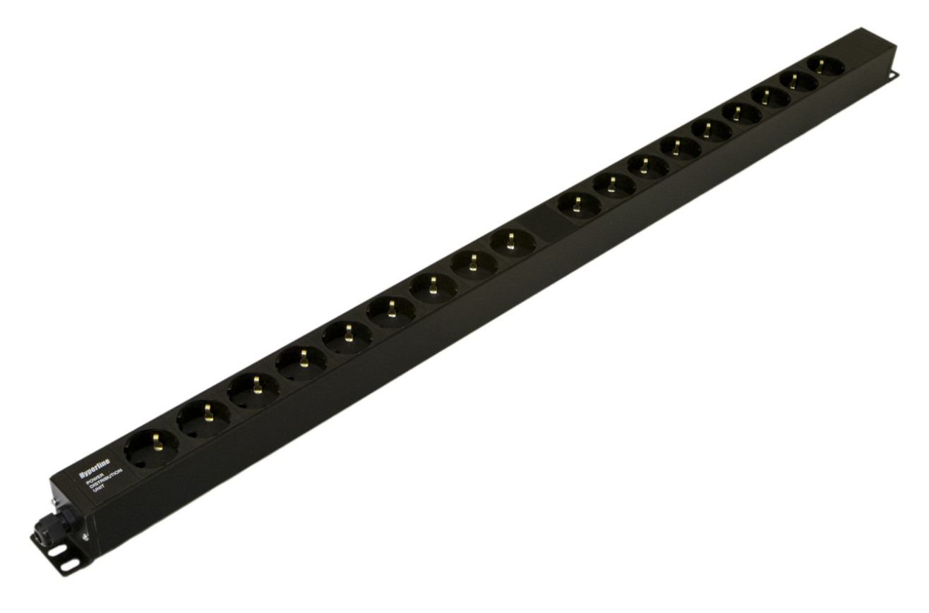Hyperline SHE-18SH-CB Блок розеток, вертикальный, 18 розеток Schuko, без кабеля питания, клеммная колодка 16 A, 250В, 950x44.4x44.4мм (ДхШхВ), корпус алюминий, черный